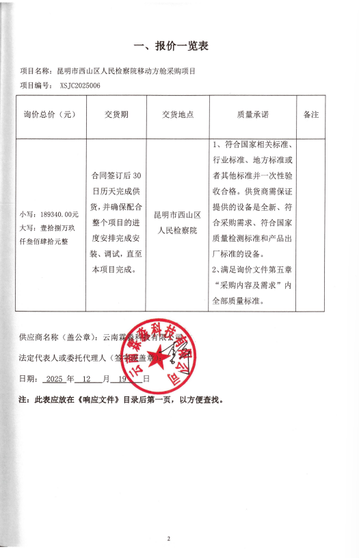昆明市西山区人民检察院移动方舱采购项目询价结果公告